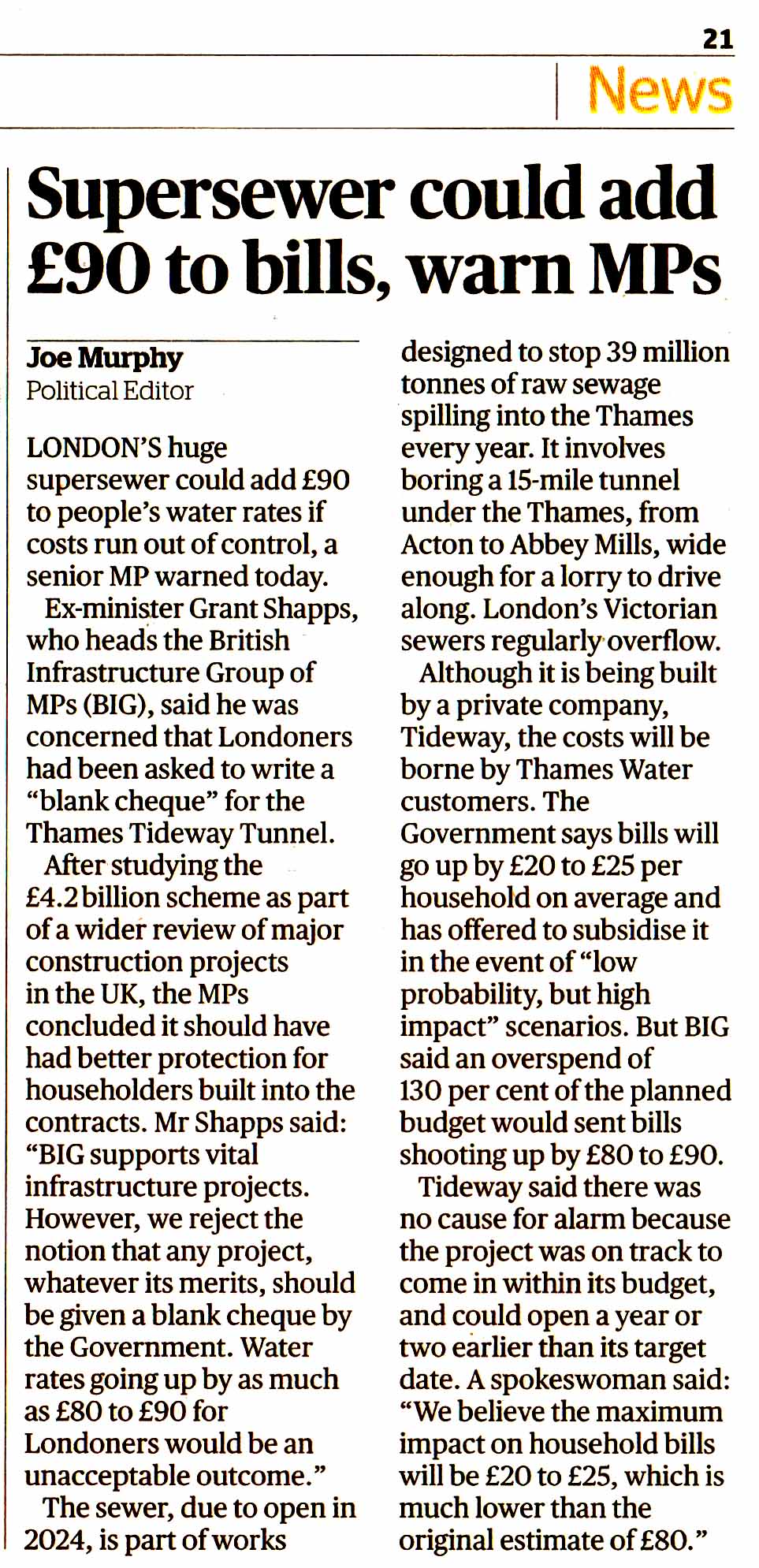 4th January 2017: Evening Standard - Supersewer could add £90 to bills, warn MPs